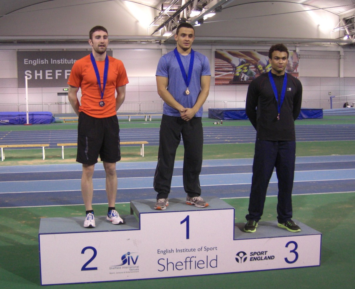 Aaron Crowley (Sale Harriers) takes Bronze in 200 m (21.72 pb indoors)Sprint event in tight final run to line with Linford Christie coached Dannish Walker Khan (Birchfield) winning in 21.44 secs he took the double winning the 60 m in 6.78 secs.